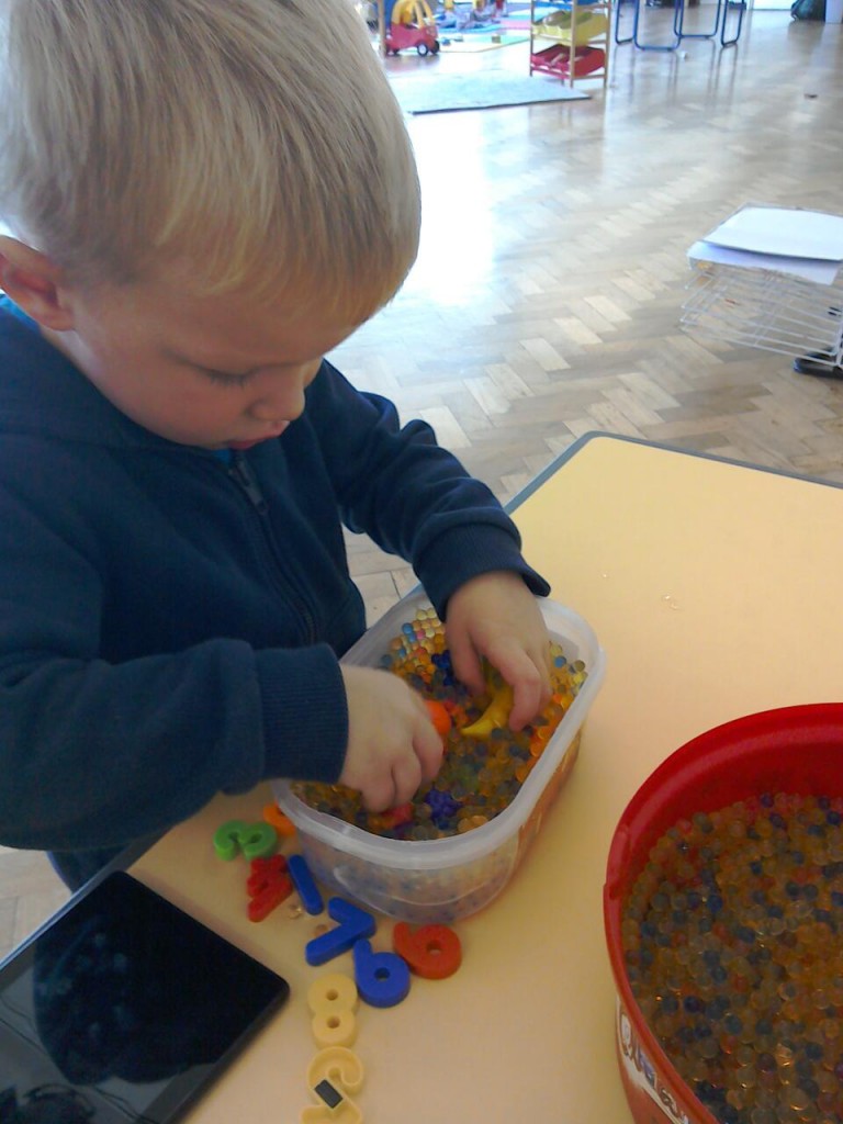 The children were trying to find objects and identify them as well as describe how the Orbeez felt. Things the children said were "they feel cold and wet", "they are really nice to touch.", "they are like jelly.", " They are slippery", "they wobble!" and "it is slimy like jelly on a plate."